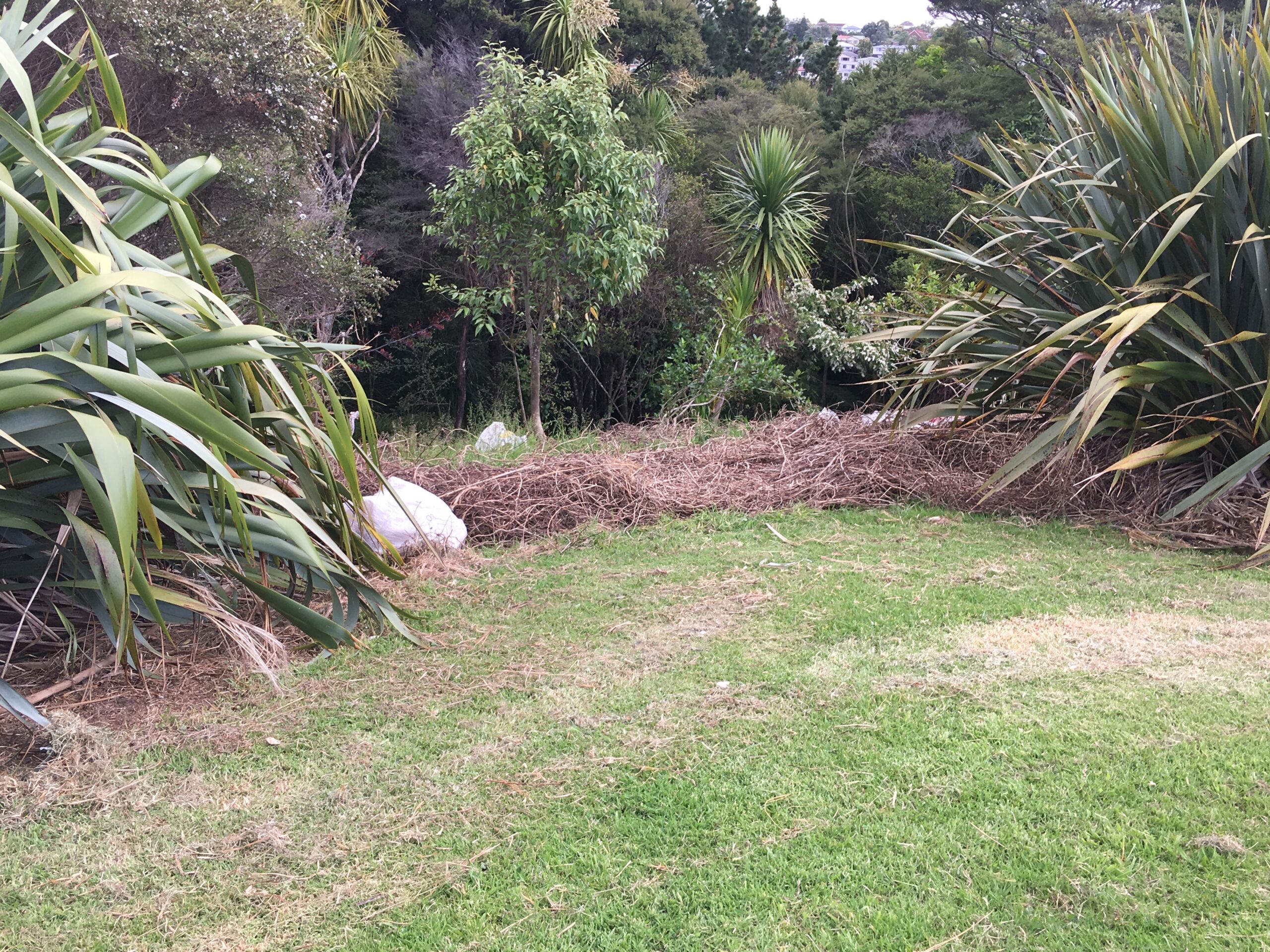 Below left: June 2018 – over a few weeks the bank has been weeded to within a few metres of the forest edge, where a wall of honeysuckle has completely covered small trees and shrubs, and almost completely covered a cabbage tree/ti kouka on the right