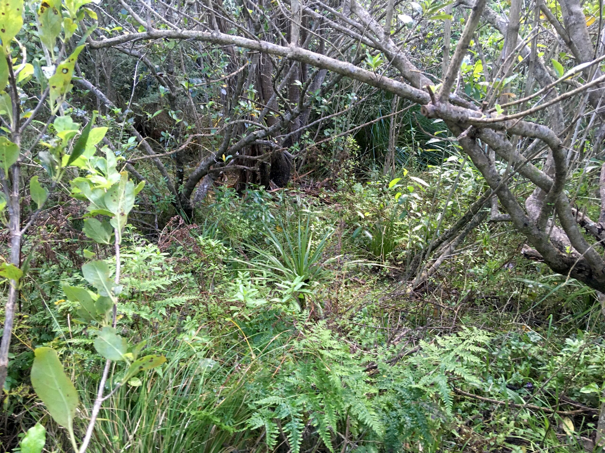 July 2025 – views from about the same spot, showing mostly native groundcover under a canopy of karamu 3-4m high.